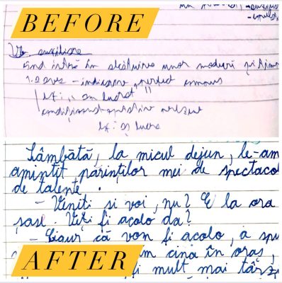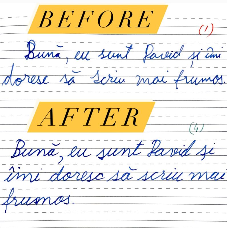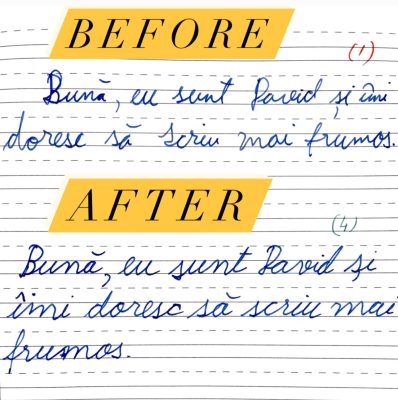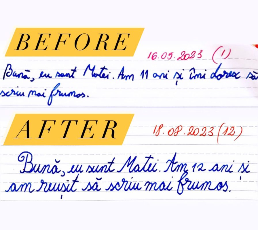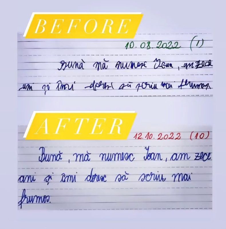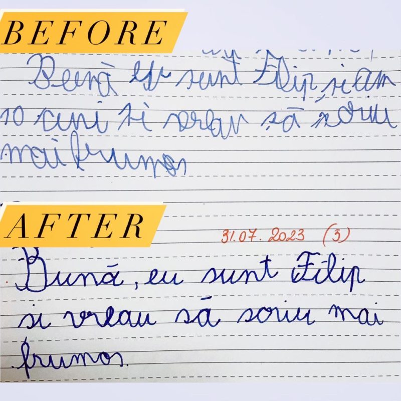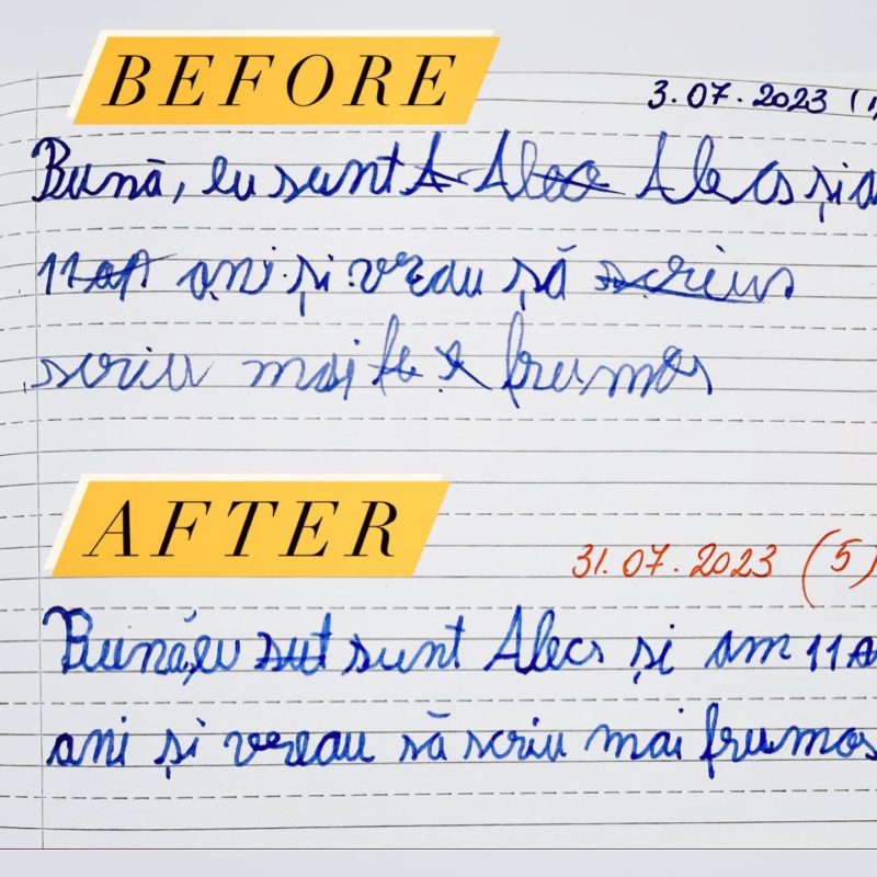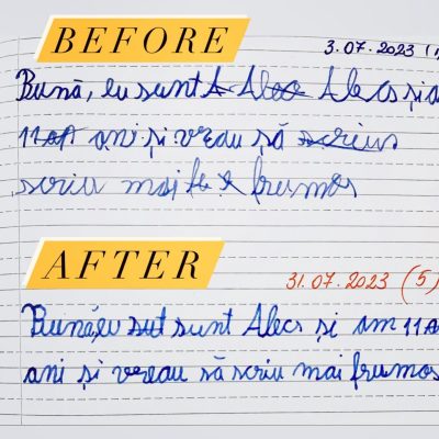 Rezultatele nu vin peste noapte. În spatele lor stau ore de exercițiu și perseverență. Ritmul fiecărui copil este diferit și ar trebui să înțelegem asta. Caligrafia are nevoie de timp. Copilul are nevoie de timp și răbdare. Acesta este secretul metodei prin care reușesc să îmi ajut cursanții să obțină asfel de rezultate.